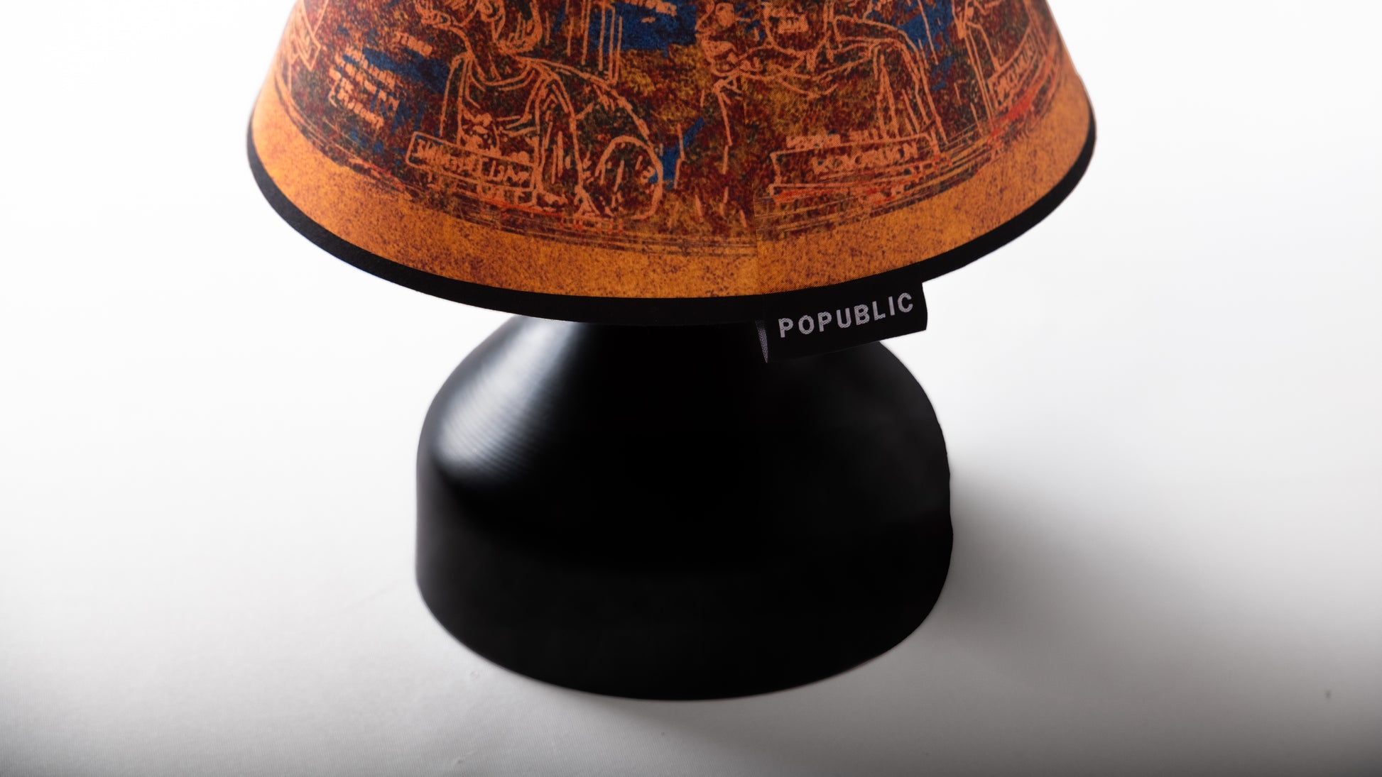 Crown, özel kumaş başlık üzerine dijital grafik baskı teknikleriyle üretilmiş, POPUBLIC desenleriyle tasarımın tüm ruhunu üzerinde taşırken; her detayına özel olarak işlenen görsel anlatım, abajura POPUBLIC’in sokak estetiğiyle bütünleşen özgün bir ifade dili kazandırıyor.