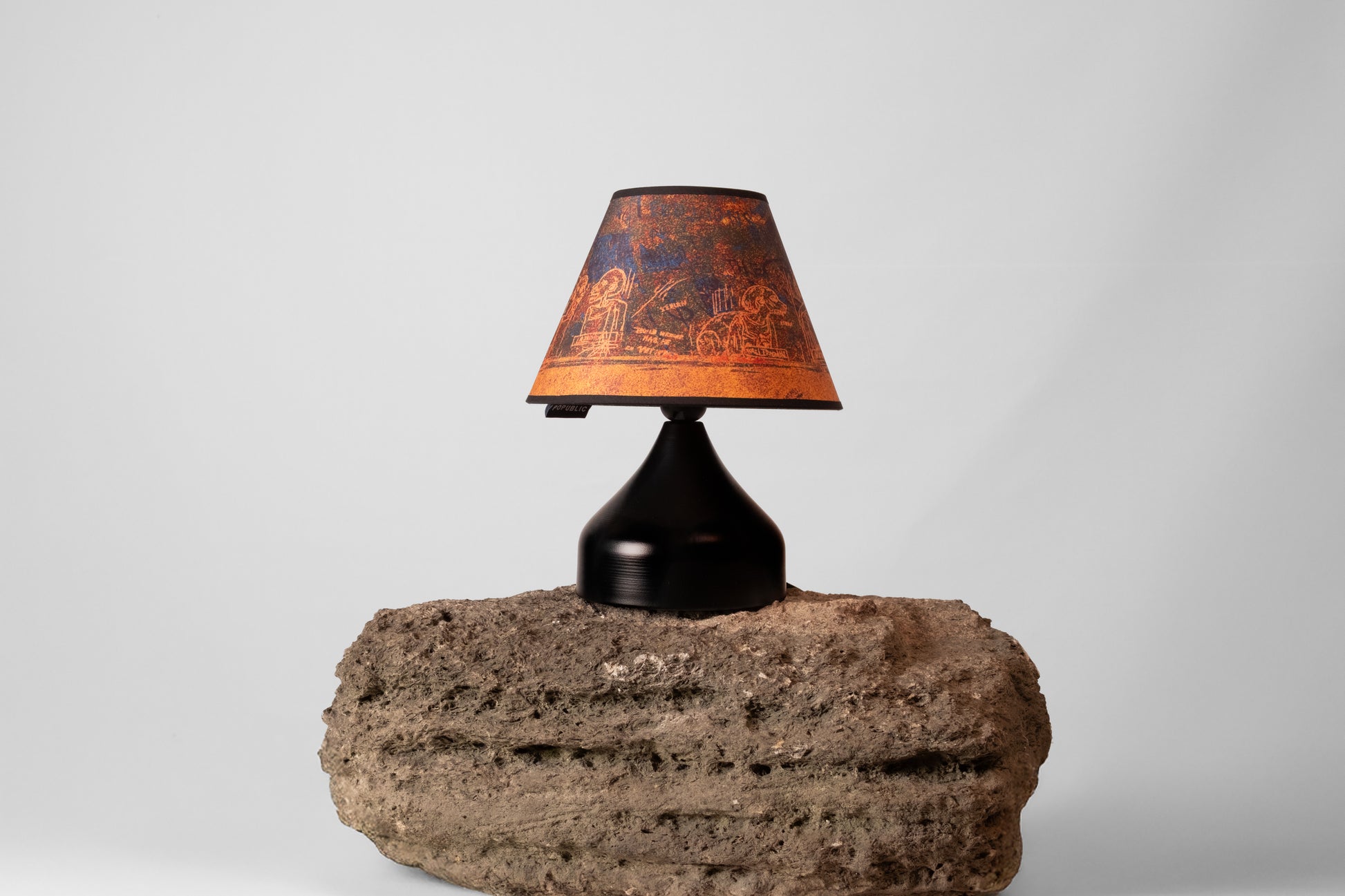 - Renk: Koyu lacivert, yanık turuncu ve bakır tonlarının kontrastı ile tasarlanmış abajur başlığı ve siyah mat tasarımın uyumu