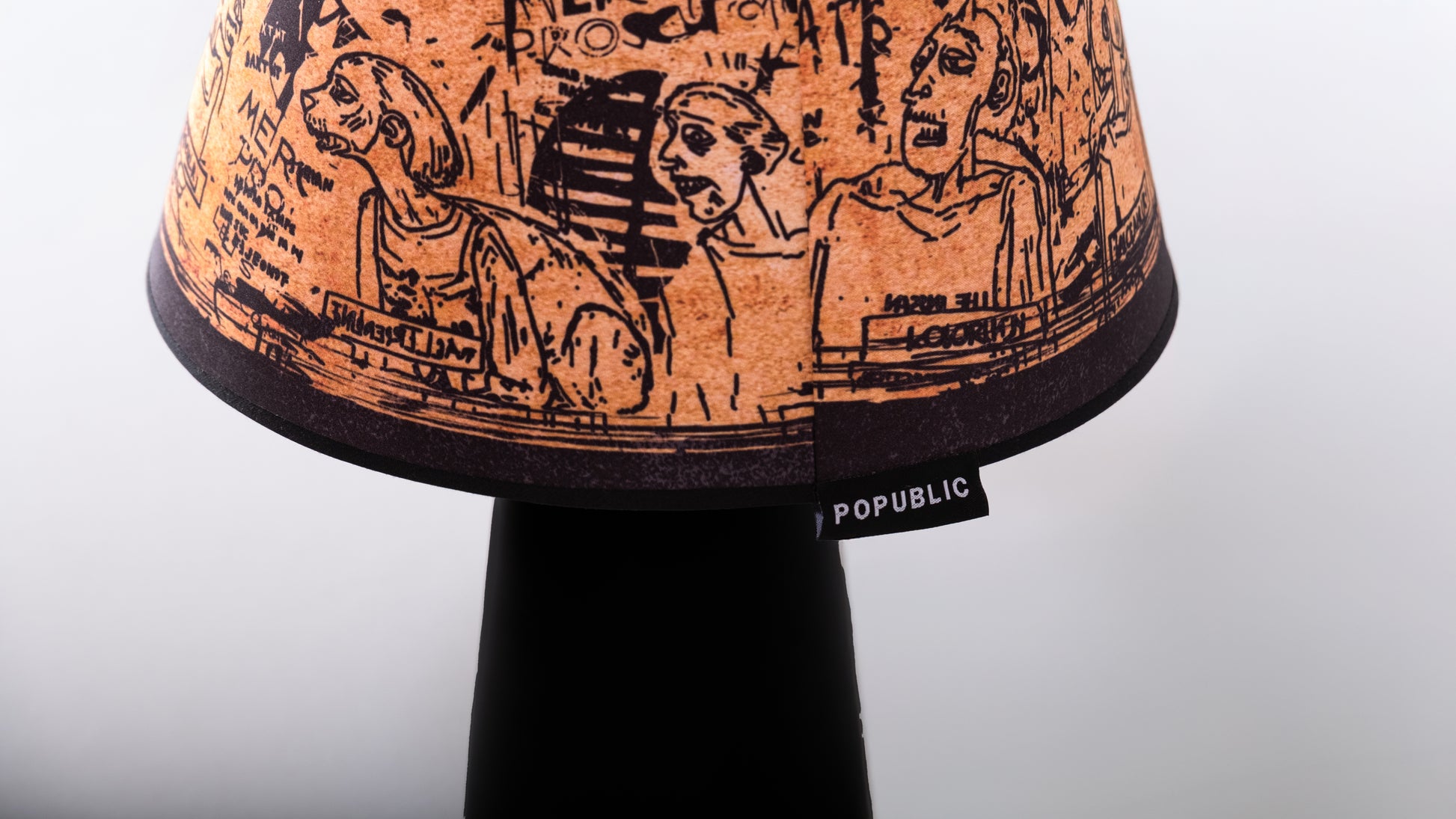 Samo, özel kumaş başlık üzerine dijital grafik baskı teknikleriyle üretilmiş, POPUBLIC desenleriyle tasarımın tüm ruhunu üzerinde taşırken; her detayına özel olarak işlenen görsel anlatım, abajura POPUBLIC’in sokak estetiğiyle bütünleşen özgün bir ifade dili kazandırıyor.